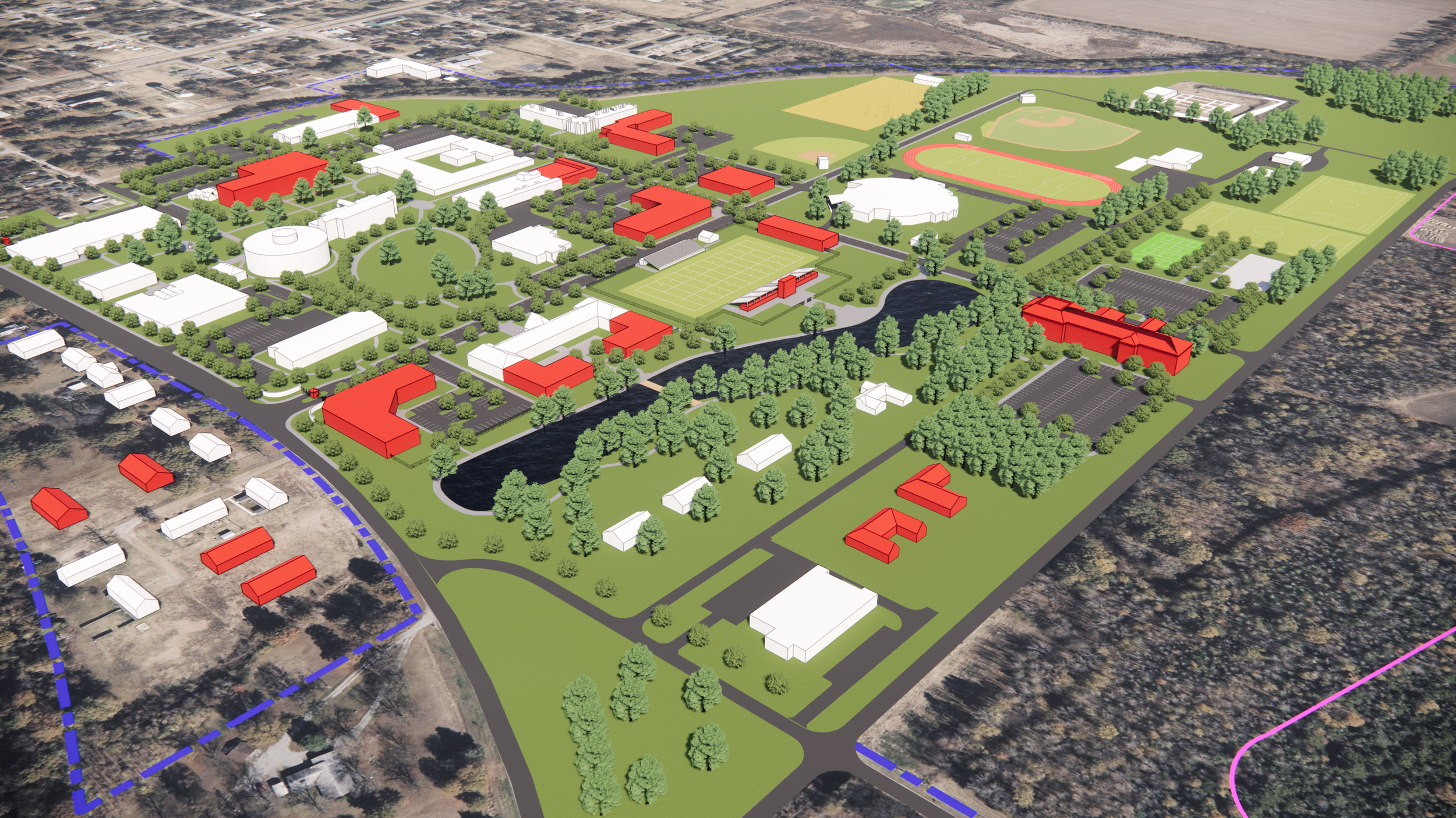 The plan will take into account the entire site (all buildings; athletic facilities including indoor and outdoor; green spaces, parking lots, sidewalks, roadways, etc.). Facilities consist of 286 acres, 41 buildings, over 800,000 square feet of structures.