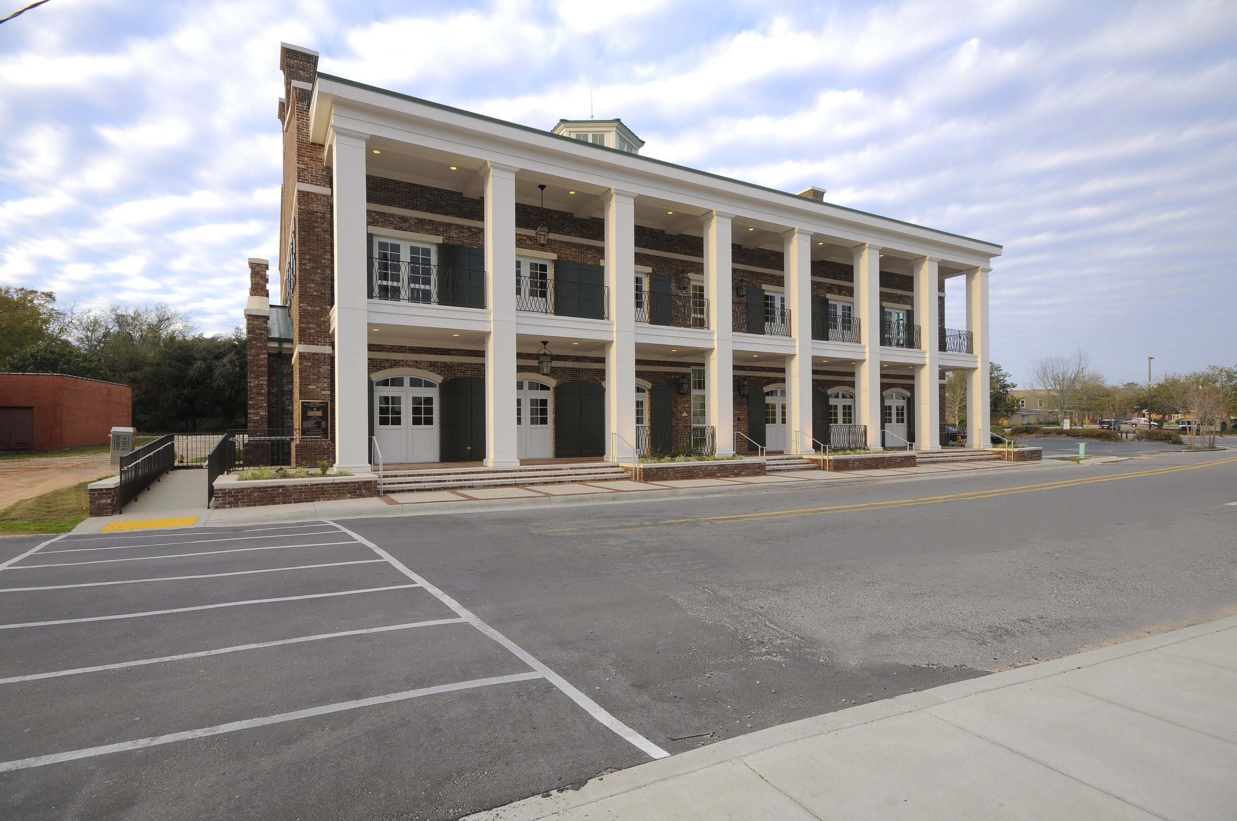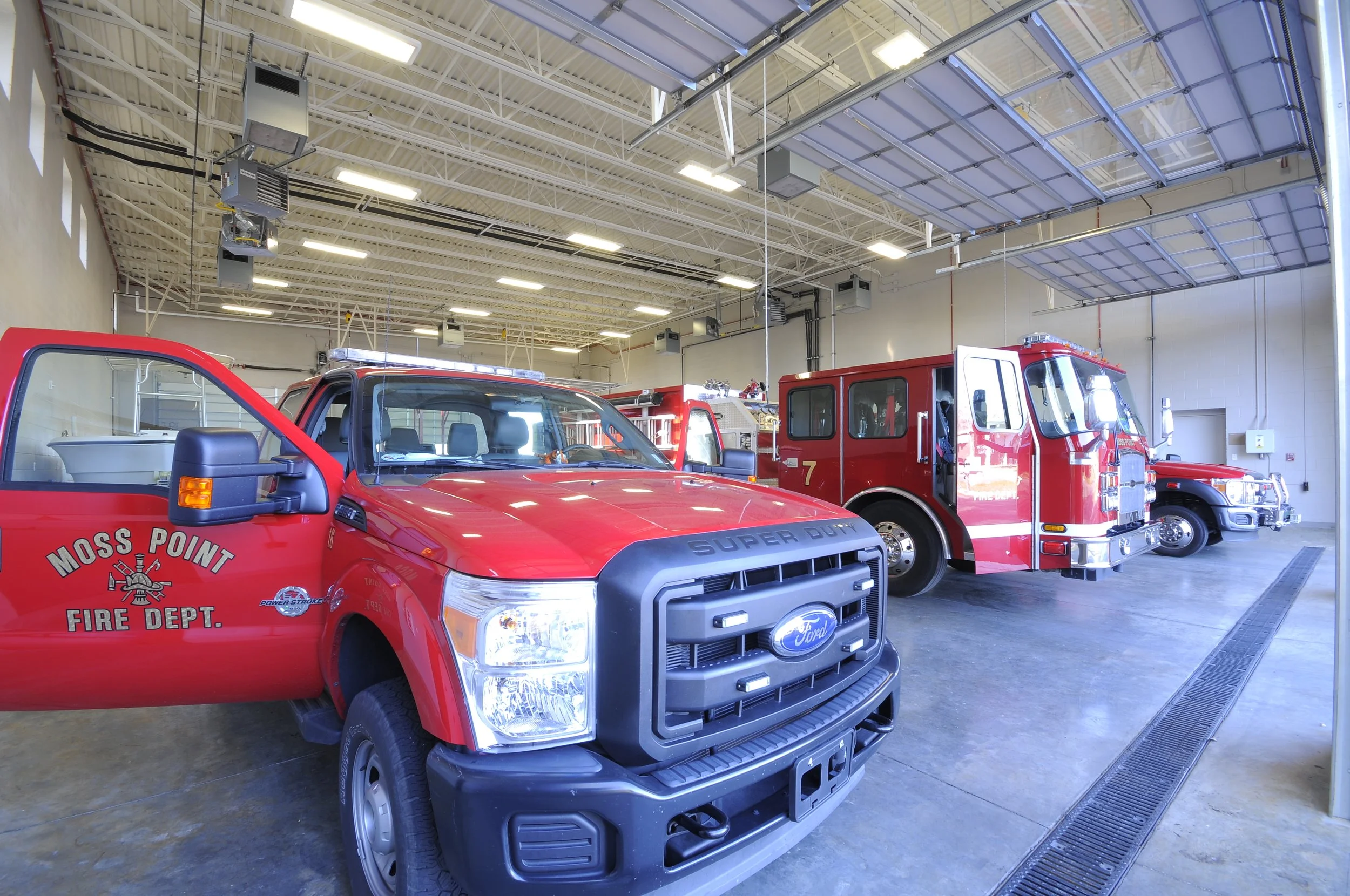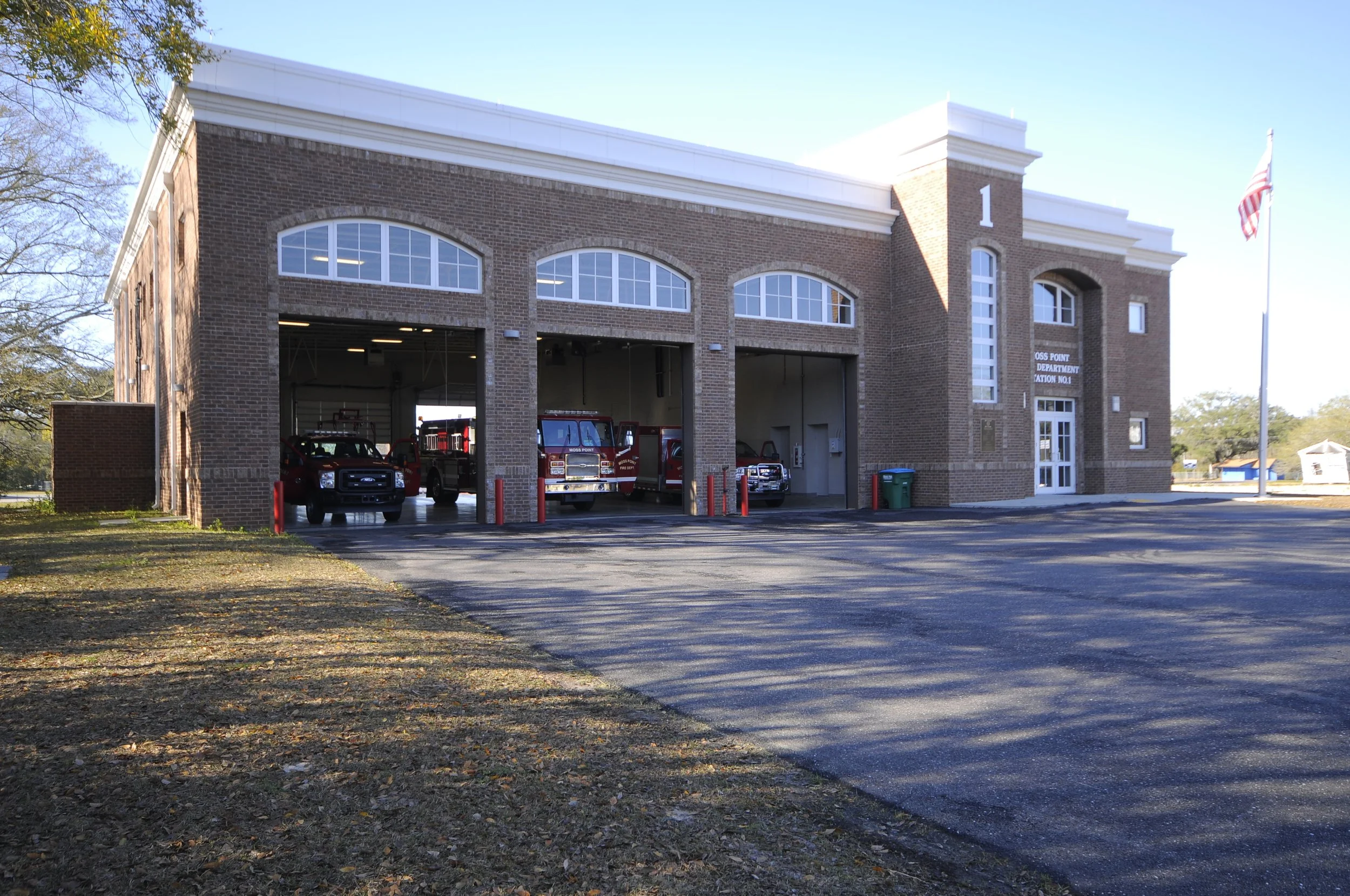 The new 9,400sf two story, three bay facility consists of reinforced concrete masonry unit (CMU) wall with the western portion of the building (living quarters, office, kitchen, etc.) hardened to meet FEMA 361 standards for Community Safe Rooms and the eastern portion of the building (apparatus Bays) being upgraded under a “wind retro-fit” FEMA 404 project. Additionally, a CDBG Grant was awarded to the City of Moss Point to improve and enlarge the facility. Both the east and west portions of the new facility will utilize FEMA 404 funds for the 361 Community Safe Room and Wind Retro-Fit.