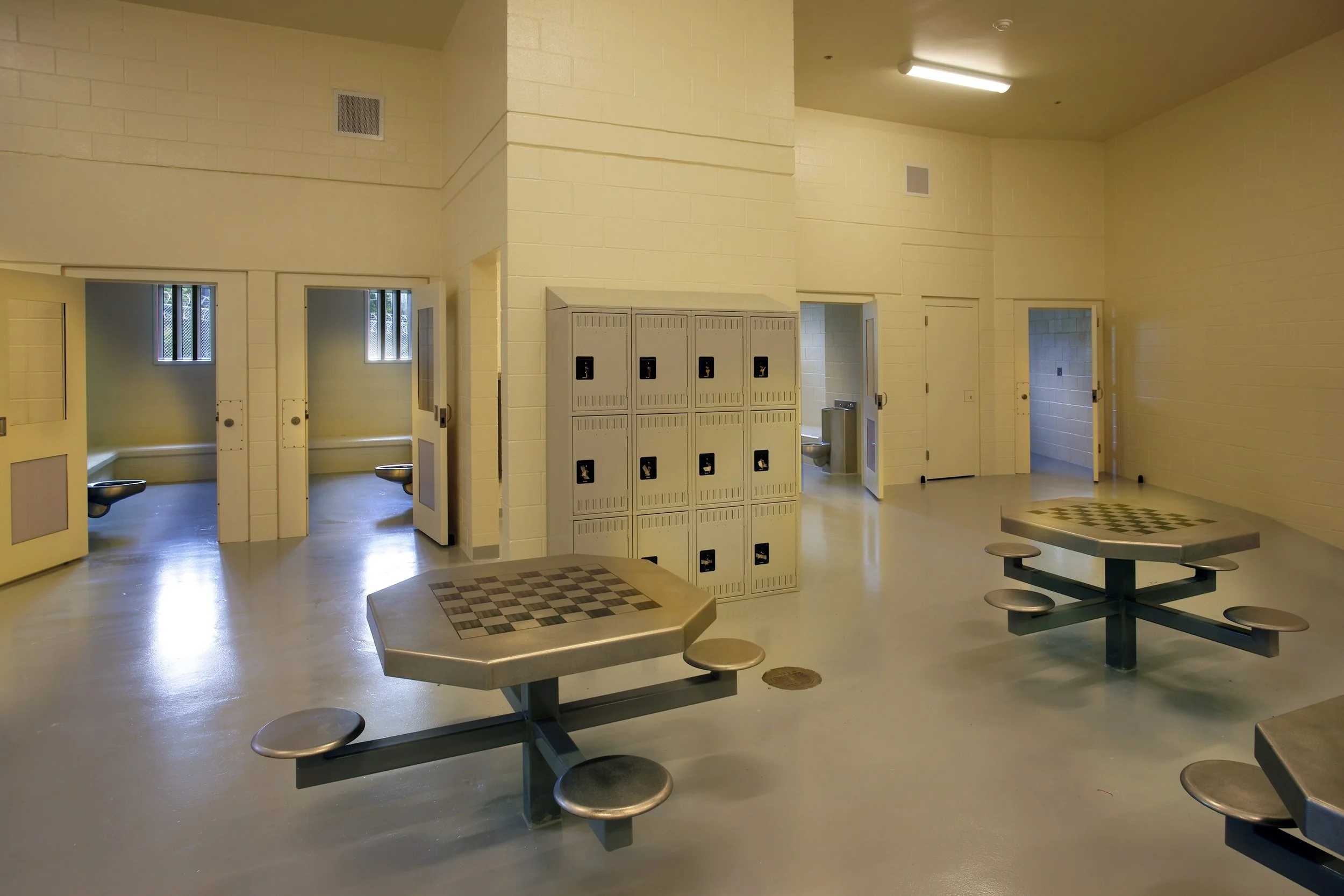 The house component is octagonal in shape and constructed of a more secure concrete masonry unit and brick veneer structure. Forty-two detainment units are arranged around a central control area and divided into seven sections, including one day-room and six cells each.